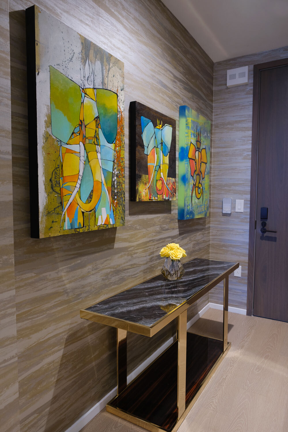 The walls aren’t the only place for art in a hallway. The best thing about decorating hallways is how easy it is to get creative with where you display things. Get a little adventurous and try hanging artwork at different levels instead of one large piece on one wall–this will keep it from feeling too cramped or cluttered in long hallways (not to mention, an eclectic grouping can draw the eye down a longer corridor).