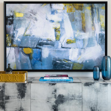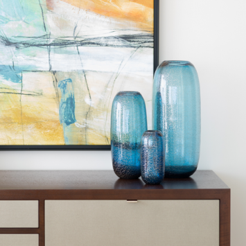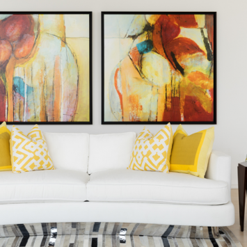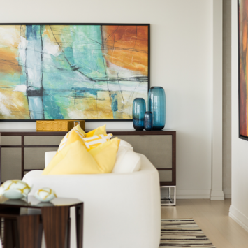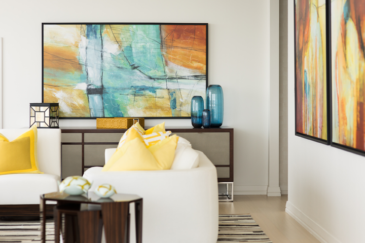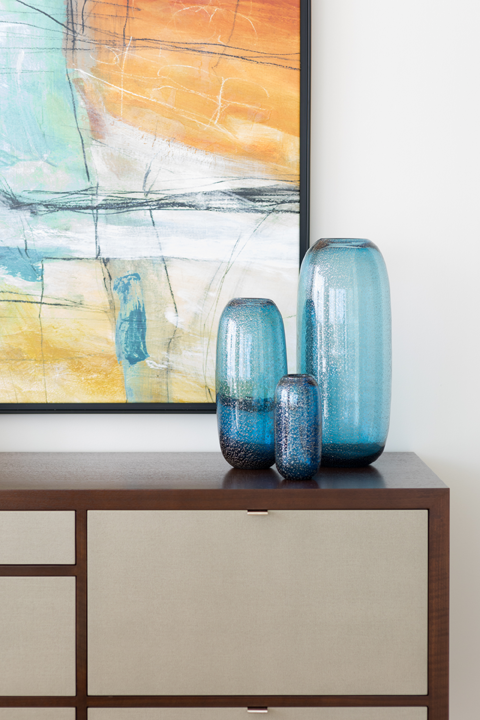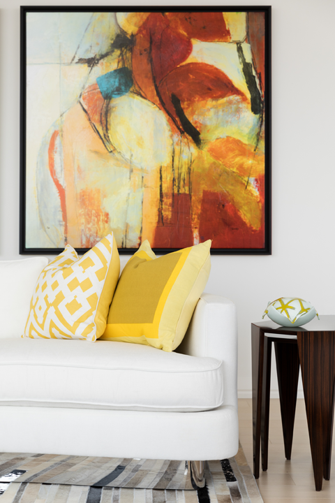 In addition to the yellow touches, other accent colors throughout the home are pulled from the artwork. Glass vases are an excellent way to incorporate color without adding a lot of visual weight. Area rugs in coordinating shades help tie each room together.