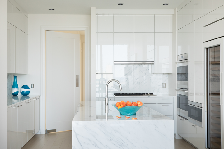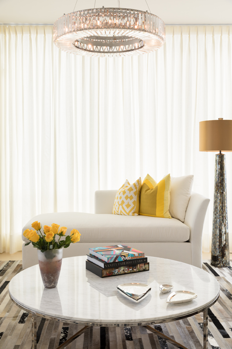Custom lighting adds impact while still keeping with the client’s minimalist preferences. Large circular glass chandeliers add shimmer and texture in the living room and bedroom. The gold-toned pendant lamp in the dining room draws the eye upward allowing you to appreciate the views.